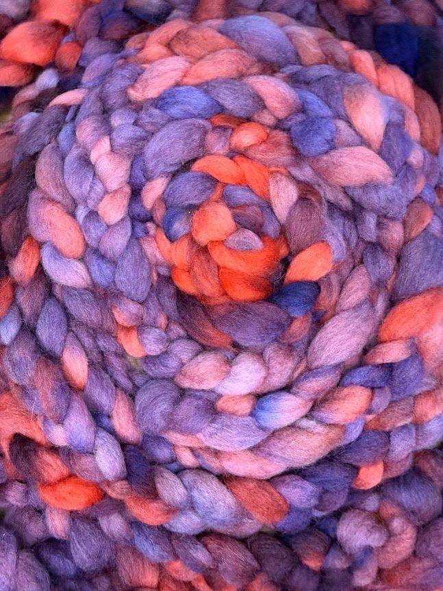 This combed top is from our small herd of merino-rambouillet sheep. It is hand dyed using Greener Shades dyes in beautiful shades of purlpe and ark pink. It can be used for both spinning and felting items that are soft enough to be worn next to the skin.
